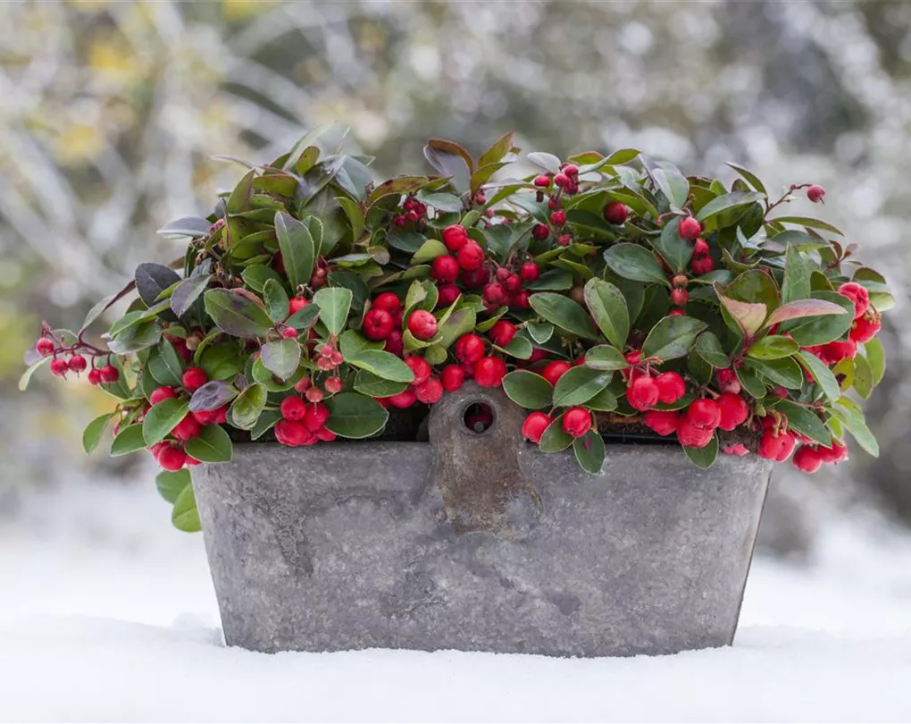 Besonders dekorativ sind die roten, angenehm duftenden, runden Früchte von Gaultheria procumbens. Diese erscheinen ab September. Haften sehr lange.