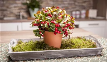 Die Rote Teppichbeere (Gaultheria procumbens) ist ein flacher, teppichartiger Zwergstrauch mit dekorativen, roten, runden Früchten, die sehr lange haften. Diese verströmen einen angenehmen Duft. Die glockenförmigen Blüten erscheinen je nach Sorte in verschiedenen Farben.Zudem trägt die Rote Teppichbeere dekorative, immergrüne, ledrige, eiförmige, dunkelgrüne Blätter.