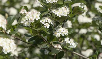 Aronia x prunifolia 'Viking' bildet in Rispen angeordnete, weiße Blüten ab Mai.