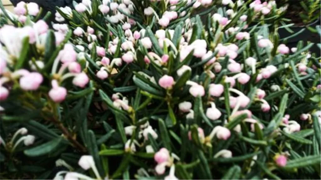 Die hellrosafarbenen Blüten der Rosmarinheide erscheinen in Dolden von Mai bis Juli.