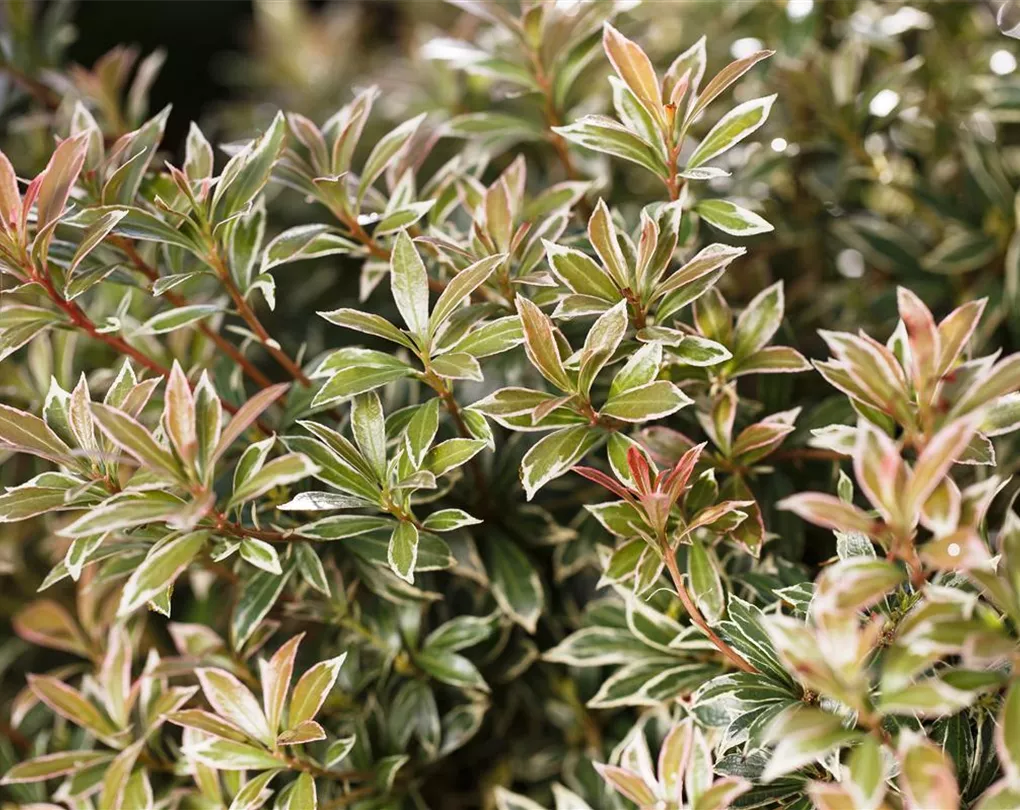 Das Schattenglöckchen 'Little Heath' (Pieris japonica) ist ein buschiger, breiter, Kleinstrauch mit dekorativen immergrünen, glänzenden, lanzettlichen, dunkelgrünen Blättern mit einem weißen Rand. Auch der rosa-rote Austrieb ist sehr schön.