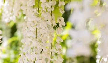 Der Weiße Blauregen 'Alba' (Wisteria sinensis) ist eine rankende Gartenpflanze, die weiße, in Trauben angeordnete Blüten mit einem angenehmen Duft hervorbringt. Sie erscheinen von Mai bis Juni. An einem sonnigen bis halbschattigen, windgeschützten Standort mit durchlässigem, lockerem, nährstoffreichem Boden erreicht er gewöhnlich eine Höhe von ca. 15 m und wird ca. 10 m breit.