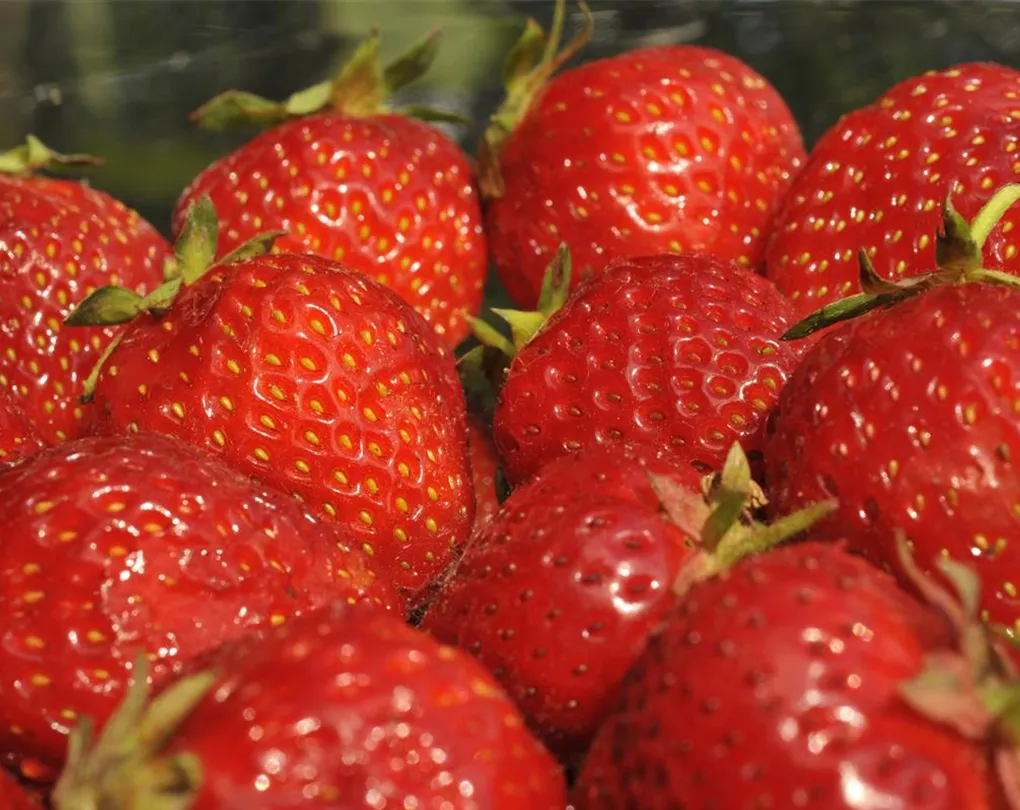 Die Erdbeere 'Senga®-Sengana®' (Fragaria x ananassa) bildet rote, sehr große Beeren. Diese sind fest und süß, aromatisch im Geschmack. Für eine ertragreiche Ernte ab Juni schaffen durchlässiger, humoser Boden und ein sonniger Standort optimale Bedingungen. Auch ihre weißen Blüten sind eine schöne Erscheinung.